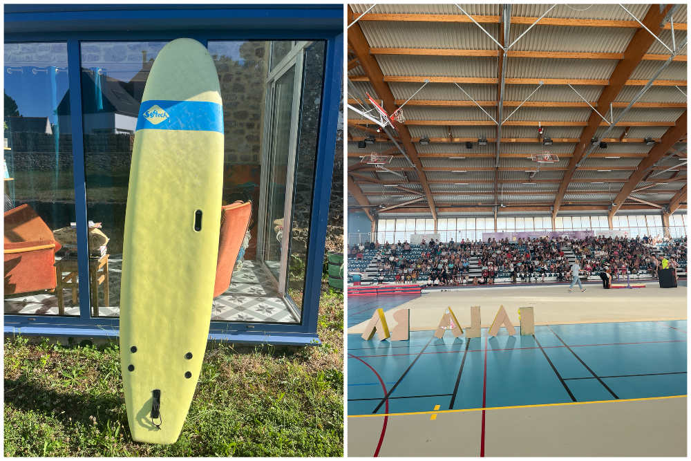 – Cette semaine, j’ai investi… sur la surfeuse qui vit en moi ! J’ai acheté une planche d’occasion qui va me permettre d’aller à l’eau hors des cours de surf… Certes, elle n’est pas rose comme je rêvais, mais au moins, on me voit bien dans l’eau ! (Et non, j’ai bien cherché, ce jaune ne va avec rien…)