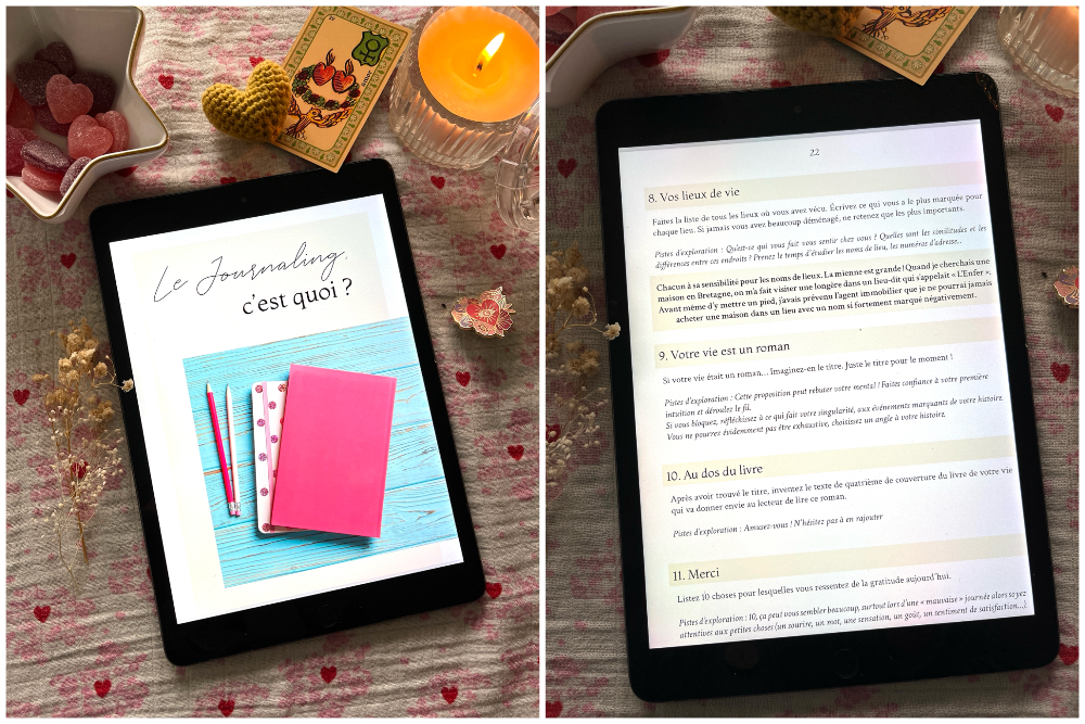 Il s’agit d’un programme où je partage avec vous une technique de journaling guidé pour vous aider à écrire votre propre journal. Il s’inspire du programme en ligne que j’avais proposé lors des 40 jours de journaling il y a deux ans. J’ai repris les consignes, je les ai dépoussiérées, j’en ai enlevé pas mal, j’en ai ajouté beaucoup (il y en a 55). J’ai construit un nouveau programme pour vous aider à mieux vous connaître et surtout, à mieux vous aimer. L’idée est de piocher chaque jour (ou au rythme que vous souhaitez) une consigne et de vous laisser inspirer. Il s’agit de questions sur vous-mêmes, vos goûts, ce qui fait votre vie. Les participantes du programme original m’avaient fait d’excellents retours et avaient été surprises de ce qu’elles avaient découvert sur elles-mêmes.